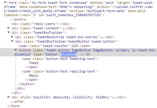 The Tweet/Reply button is currently greyed out because it has the "disabled" attribute. You need to double click on it and remove that attribute. Also, in the class attribute, there is also a "disabled" part. Double-click, then click on that and removed just that disabled as well, without impacting the stuff around it. This should change the button from disabled to enabled. It won't be greyed out, and it'll respond when you click on it.