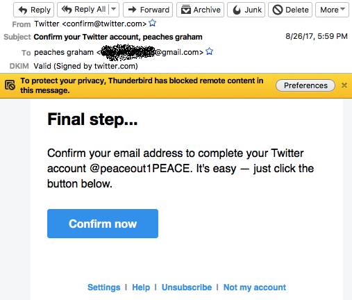 I look further back and find that there were also confirmation messages involved. Back in August, she got a typical Twitter account signup message. I am now seeing a little bit more of the story unfold with this "Peaches Graham" name on the account. It wasn't my mother who initially signed up for Twitter, but Peaches, who misspelled the email address. It's one of the reasons why the confirmation process exists, to make sure you spelled your email address correctly.
