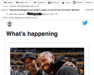 This is how the problem descriptions always start, chaotic, with mutually exclusive possibilities. If you don't use Twitter, you don't have the Twitter app installed, so how are you getting Tweets? Over much gnashing of teeth, it comes out that she's getting emails from Twitter, not tweets, about Denzel Washington -- to someone named "Peaches Graham". Naturally, she can only describe these emails, because she's already deleted them.