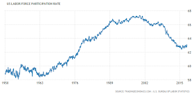 But here's the thing, the "unemployment rate" only measures those looking for work, not those who have given up. The number that concerns people more is the "labor force participation rate". The Great Recession kicked a lot of workers out of the economy.
