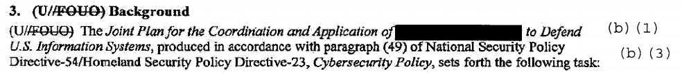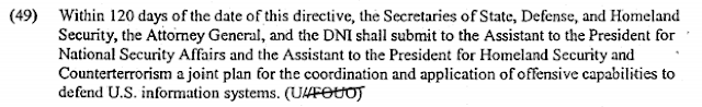 The next redaction is refers to paragraph 49 of NSPD-54/HSPD-23. Well, EPIC got this document a while ago, and it's here (http://fas.org/irp/offdocs/nspd/nspd-54.pdf) (also here). Though paragraph 49 is redacted here, we can read it form the original document there.