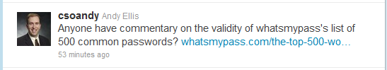 As this tweet asks: what's the validity of the various lists of the most common passwords people choose, such as this one http://www.whatsmypass.com/the-top-500-worst-passwords-of-all-time.