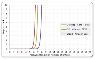 For brute-forcing passwords, people imagine that GPUs or Amazon EC2 clusters will make a massive difference. As the graph shows, they really don't. Short passwords are trivial to crack, even with the resources of an iPhone. Long passwords are impractical to crack, even with a billion dollar NSA supercomputer.